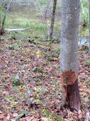 When we first bought the land back in 1998 this pool was one of our first discoveries. Technically it is a vernal pool but of all our vernal pools it is the most likely to muddle through to the wet fall with water in it. I had sat around it in the spring and couldn’t imagine a beaver would gnaw the big old pines, hemlocks and hardwoods around it. The birches there were either long dead or not their favorite kind. Tannin from hemlock and pine litter darkened the pool. The beavers in it didn’t raise any mud. No trees around it were cut, but I saw some stripped twigs floating in it.