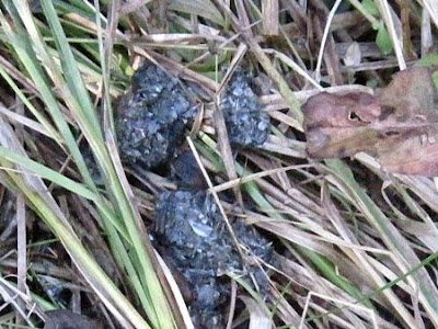 The scat pictured above was in the dirt below a flat rock where I had seen piles of black scats a few weeks ago. There were dollops of dry scat up on the rock, too.