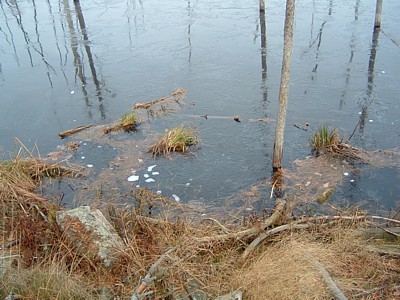 and then at the mossy rock, along the dam, and at the lodge. The bigger holes, now frozen over, were at the lodge.