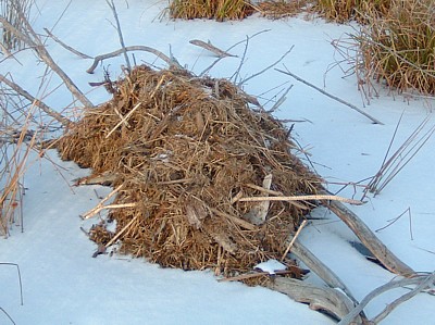 probably by a muskrat. I took the trail to the East Trail pausing to check the old South Bay dock, which I had not done all year. I saw some very old otter scats, and also how holes were dug under the ramp back into the bank -- a likely otter den. At the East Trail Pond the beavers have evidently been out at several places. And even with holes along the edges and that patch of weak ice caused by the big blocking log behind it and the dam, they still punched three holes in the ice. At one they went up and over to half cut a maple. Two of the holes behind the dam were open water. Near the bank lodge all was frozen over, but I could see evidence of much nibbling and even more mud packing on the lodge.